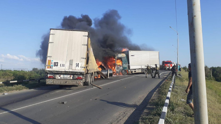 Ранее Toyota Land Cruiser и фура попали в жуткое ДТП на трассе Алматы - Кордай. В результате столкновения обе машины загорелись.