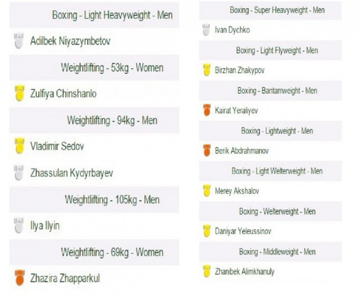 "Серебром" помимо Ильина порадуют боксеры Иван Дычко и Адильбек Ниязымбетов, а также штангист Жасулан Кыдырбаев. Бронзовые медали будут на счету боксеров Берика Абдрахманова и Кайрата Ералиева, а также штангистки Жазиры Жапаркуль.