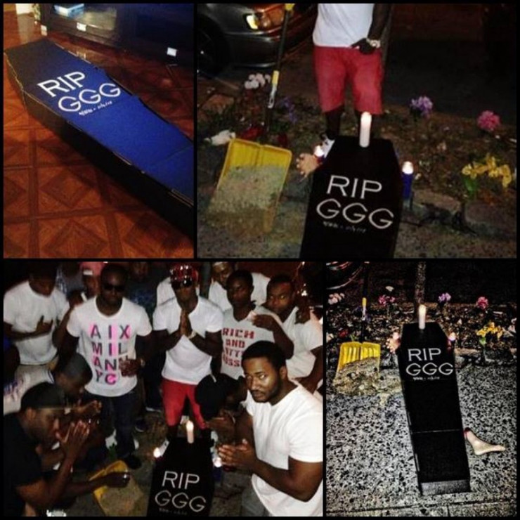 Ал кейін Головкинді "жерлеп", оның суреттерін Желіде таратқан. Онда табыт көрсетіліп, үстіне "R.I.P. GGG" деп жазылған.