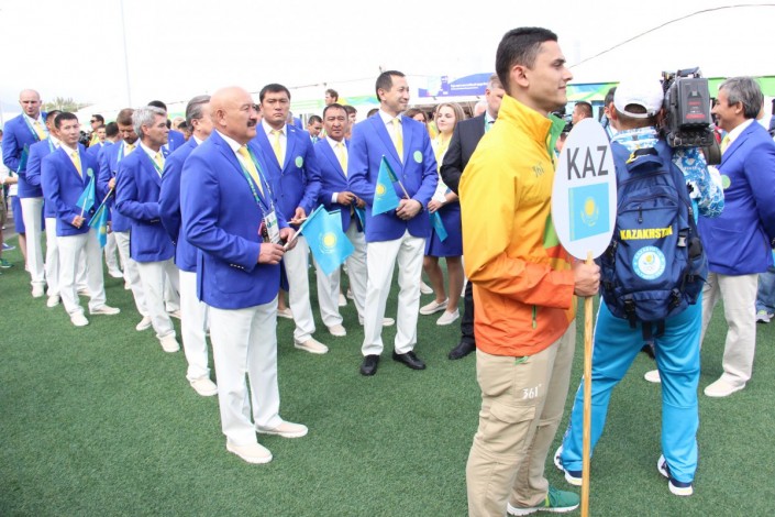 Сама церемония поднятия флага сопровождалась костюмированным представлением в национальном стиле. В настоящее время на игры приехали 50 казахстанских спортсменов из 104. Некоторые команды, например, тяжелоатлеты, прибывают на турнир группами.