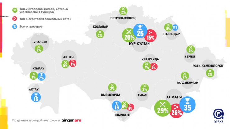 Алматы дает практически треть всех участников турниров на Pinger.Pro (29 процентов), среди представителей Алматы – 35 призеров казахстанских киберсостязаний: 26 алматинцев попадали в тройку лучших в составах различных команд в коллективных дисциплинах, и 9 человек из этого города становились призерами индивидуальных состязаний. Это привело и к большому зрительскому интересу: четверть аудитории платформы (26 процентов) – это зрители из Алматы.