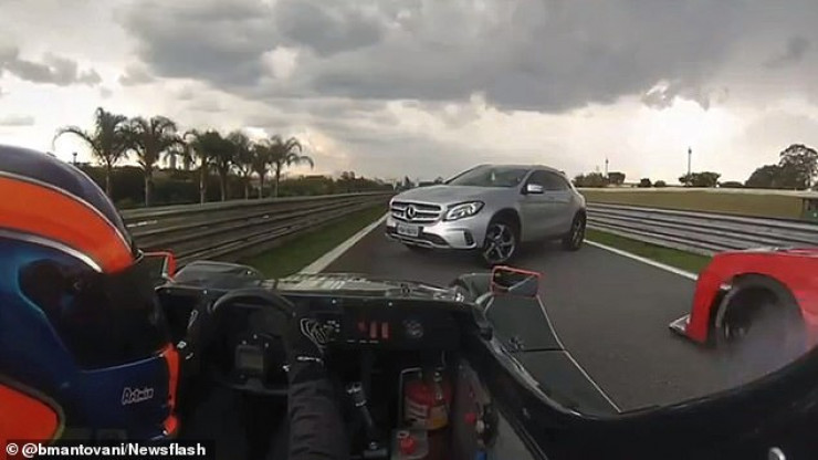 Гонщик жестами начал показывать водителю Mercedes, чтобы тот убрал машину с пути, однако водитель растерялся и начал поворачивать то в одну, то в другую сторону, тем самым задерживая гонку. Более того, со стороны пит-лейна выехал еще один гонщик и тоже натолкнулся на абсолютно неожиданное препятствие.