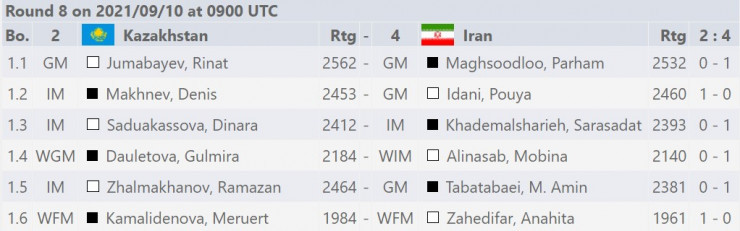 В восьмом туре сборная Казахстана проиграла Ирану со счетом 2-4 и потерпела первое поражение на онлайн-олимпиаде. Причем после шестого тура Казахстан играл не основным составом. Это поражение отодвинуло казахстанских шахматистов на второе место в группе, а вперед вышел Китай.