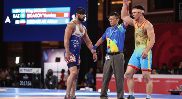 Азамат Кустубаев в схватке за третье место в весовой категории 87 килограммов победил представителя Индии Харприта Сингха (6:3).