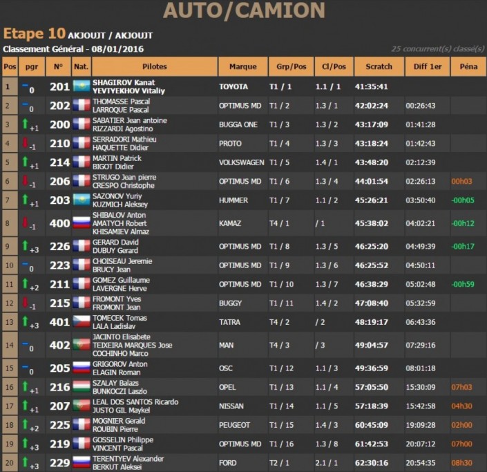 В "серийном" зачете внедорожников T2 единственный представитель Казахстана экипаж команды Off Road Kazakhstan в составе Марата Абыкаева и Андрея Чипенко, выступающий на Toyota, вновь стал вторым, проиграв лишь лидерам данного зачета россиянам Александру Терентьеву и Алексею Беркуту. По итогам десяти дней Абыкаев и Чипенко удерживают второе место в зачете Т2 и 23-е в абсолютной таблице.