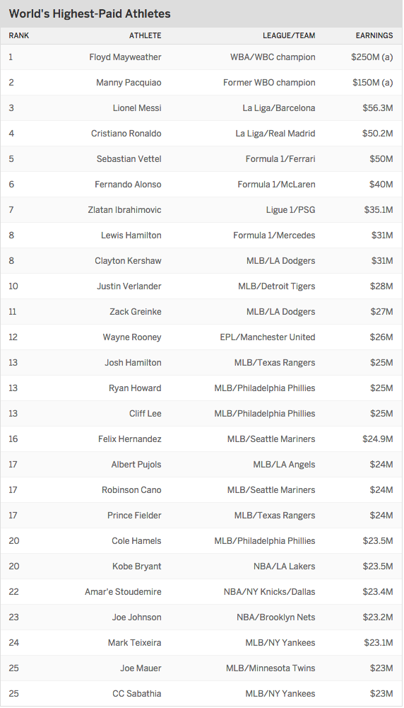 Самым высокооплачиваемым спортсменом по версии ESPN The Magazine стал Флойд Мейвезер. За бой с Мэнни Пакьяо, который состоялся 2 мая 2015, самый высокооплачиваемый спортсмен заработал 250 миллионов долларов или 6 миллионов долларов за каждую минуту боя. Его оппонент заработал 150 миллионов и занял второе место рейтинга.