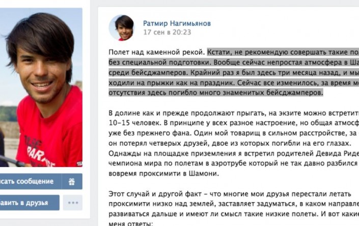 "Не рекомендую совершать такие полеты без специальной подготовки. Вообще сейчас непростая атмосфера в Шамони среди бейсджамперов. Крайний раз я был здесь три месяца назад, и мы ходили на прыжки как на праздник. Сейчас все изменилось, за время моего отсутствия здесь погибло много знаменитых бейсджамперов", - написал Ратмир всего две недели назад.