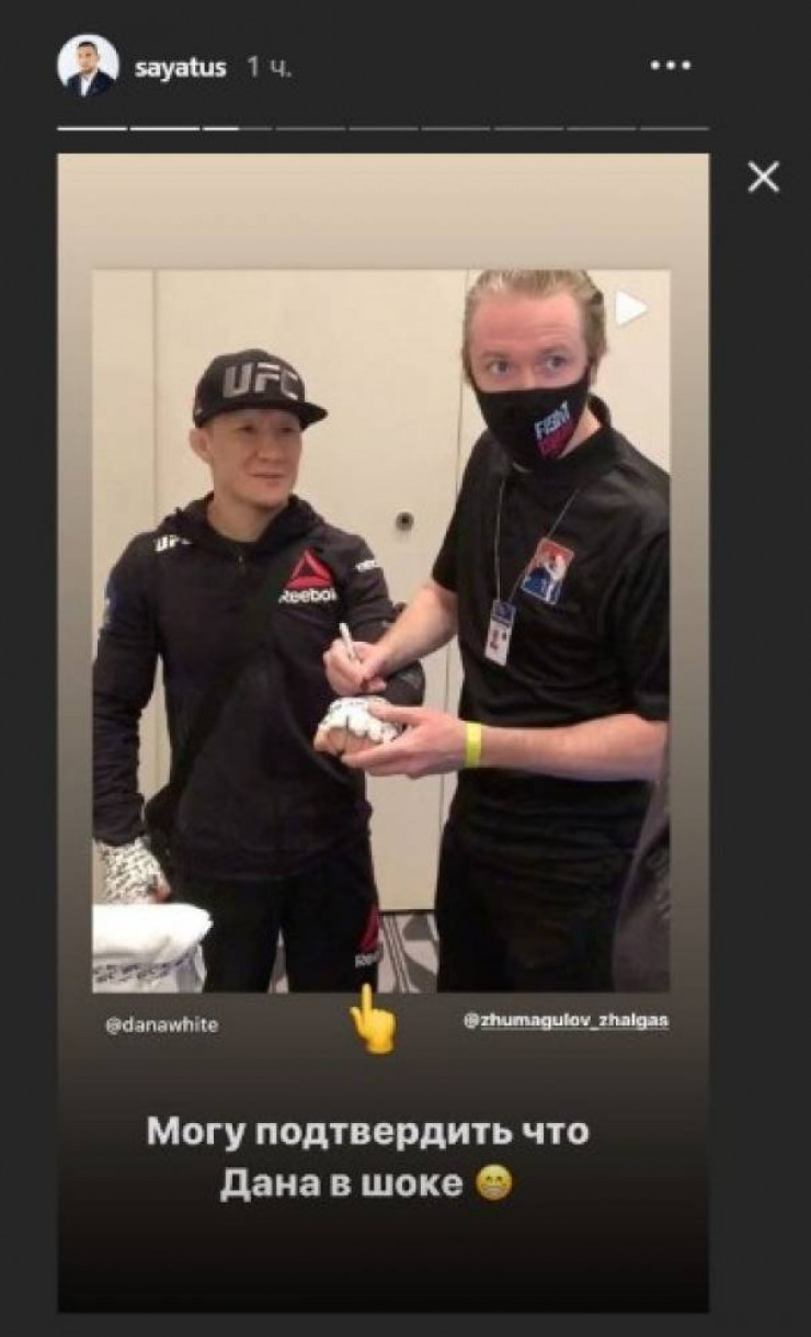 Казахстанский менеджер Саят Абдрахманов, представляющий интересы Жалгаса Жумагулова, репостнул публикацию президента UFC Даны Уайта в Instagram, передает корреспондент Tengrinews.kz.