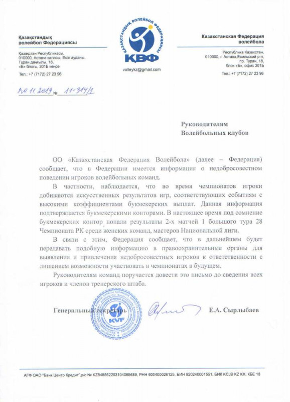 Накануне Сырлыбаев обнародовал на сайте федерации адресованное руководителям клубов письмо, где сослался на информацию о недобросовестных игроках, которые обеспечили результат для прохода крупных ставок в букмекерских конторах.
