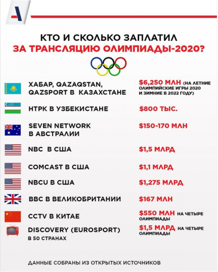 Стоимость трансляции Олимпийских игр для разных стран привела информационная служба Aibat, передает Tengrinews.kz.