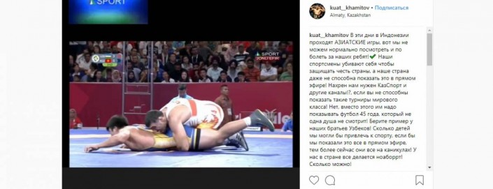 "В эти дни в Индонезии проходят Азиатские игры, вот, мы не можем нормально посмотреть и поболеть за наших ребят! Наши спортсмены убивают себя, чтобы защищать честь страны, а наша страна даже не способна показать это в прямом эфире! Зачем нам нужен КазСпорт и другие каналы!? Если вы не способны показать такие турниры мирового класса! Нет, вместо этого им надо показывать футбол 45-го года, который ни одна душа не смотрит! Берите пример у наших братьев узбеков! Сколько детей мы могли бы привлечь к спорту, если бы мы показали это все в прямом эфире, тем более сейчас они все на каникулах! У нас в стране все делается наоборот! Сколько можно!" - написал Хамитов в своем аккаунте в Instagram.