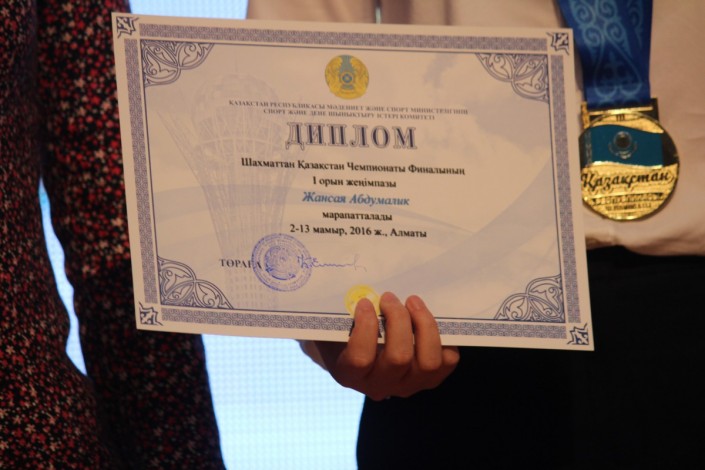 Торжественное награждение победителей и призеров турнира состоялось сегодня, 13 мая. Соревнования проходили в Алматы со 2 по 13 мая. В турнире приняли участие 22 шахматиста со всего Казахстана. Спортсмены выявляли сильнейшего в течение 11 дней. Среди женщин победу одержала юная Жансая Абдумалик. Серебряную медаль завоевала Елена Анкудинова. Третье место осталось за Гульмирой Даулетовой.