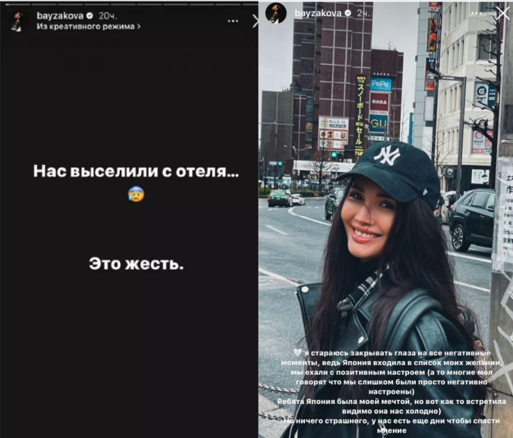 Байзакова отметила, что Япония была в ее списке самых желанных стран для отдыха, более того, девушка позитивно настроилась и с энтузиазмом собралась исследовать ее. Однако едва успели супруги заселиться, их скоропостижно выпроводили из токийского отеля.