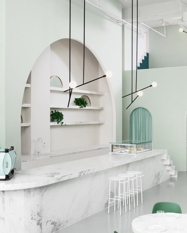 Кафе в столице провинции Сычуань, которое находится внутри отеля Budapest, имеет минималистский дизайн с оттенками розового и серого. Декор вдохновлен фильмом Grand Budapest Hotel, снятым Уэсом Андерсоном. Мраморные поверхности с геометрическими фасадами создают непринужденную, спокойную атмосферу. Владельцы кафе выбрали австралийскую студию дизайна, чтобы создать обстановку, которая бы понравилась международной аудитории.