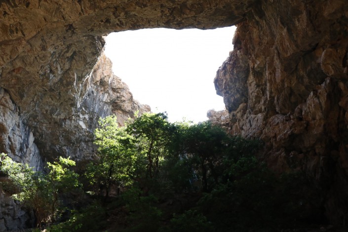 Пещера Акмешит, Шымкент, Казахстан. Одно из самых загадочных мест Южного Казахстана - пещера Акмешит. Находится на юго-восточном склоне хребта Каратау. Снаружи вход в гигантскую впадину почти незаметен. Но при спуске перед вами открывается живописная картина. Внутри пещеры растут деревья и обитают птицы. Пещера в высоту достигает 20 метров, изнутри края гигантской пещеры похожи на шанырак. Сюда приходит много паломников, которые верят, что пещера может излечить от болезней и бездетности. Также существует несколько обрядов для загадывания желаний. По одной традиции надо встать в ее центре и подумать о заветном, по другой - просто сложить камешки столбиком у входа в пещеру, загадав желание.