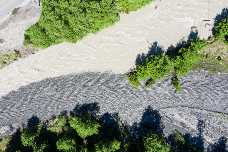 Ниже в уже сформированный из двух поток воды впадает Пшавская Арагви. У этой реки обычный синевато-зеленый цвет.