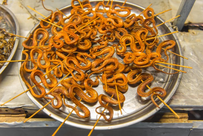 Змеи ассоциируются у большинства людей с опасностью - даже не ядовитые, эти рептилии могут заживо проглотить человека или задушить его. Однако в некоторых регионах змей не только не боятся, но и активно употребляют в пищу. На Бали, в южных районах Китая и во Вьетнаме можно попробовать не только суп из змеи, кобру на гриле, змею в панировке, запеченную змею с рисом, овощами или грибами, но и коктейли из крови змеи, которые, как уверены местные жители, обладают эффектом афродизиака. По вкусу мясо змеи немного похоже на куриное, только нежнее, при этом в нем относительно мало калорий — около 98 на 100 граммов, поэтому такое мясо считается диетическим.