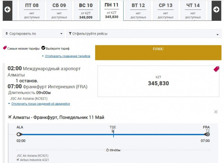 Прямой рейс во Франкфурт из Нур-Султана возможен также 11 мая, стоимостью 344 603 тенге. Последующие даты вылетов начинаются с 16 мая, по цене от 215 225 тенге. Обратный рейс в Казахстан отображается только на 16 мая, и система выдает одно оставшееся место.