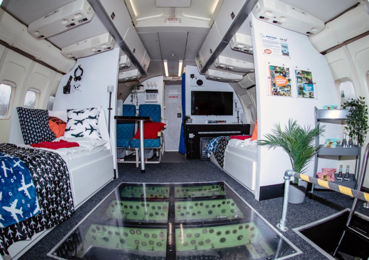 Передняя половина авиалайнера 737-й модели рассчитана на четырех человек: есть двуспальная кровать в грузовом отсеке и гидромассажная ванна в старом кожухе реактивного двигателя.