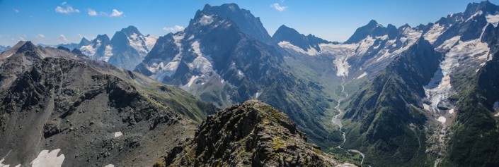 С одной стороны – склоны горы Мусса-Ачитара, с другой – отвесные стены массива Джугутурлучат, а впереди – холодные и грозные вершины Домбай-Ульген и Птыш. Мурашки по коже – то ли от влажного ветра, то ли от прохладной одежды, то ли от оглушительной тишины. Интуиция кричит: "Обернись!", и мы медленно, очень медленно, оглядываемся назад. Там пока еще беззвучно, но от этого не менее зловеще: тяжелая свинцовая туча подбирается все ближе к нам.