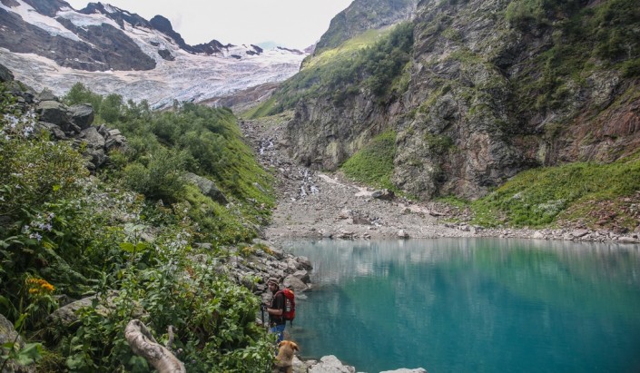Турье озеро встретило нас той наполненной жизнью тишиной, которая бывает лишь в горах. Какое-то странное оцепенение навалилось на нас. Глядя на сине-зеленую гладь озера, слушая дыхание Алибекского ледника, казалось, что время остановилось. Лучше всего, на мой взгляд, это состояние передают стихи Ольги Берггольц "Дорога в горы": "…Что было вечно? Что мгновенно? Не знаю, и не все ль равно, когда с красою неизменной ты вдруг становишься одно. Когда такая тишина, когда собой душа полна, когда она бесстрашно верит в один-единственный ответ – что время бытию не мера, что смерти не было и нет…"