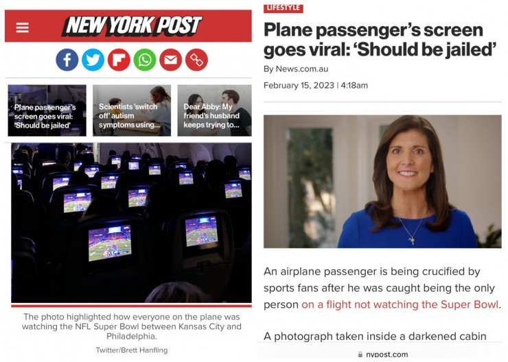 Пассажир самолета предпочел Супербоулу романтический фильм, рассмешив СМИ и соцсети Фото: Twitter/Brett_Hanfling