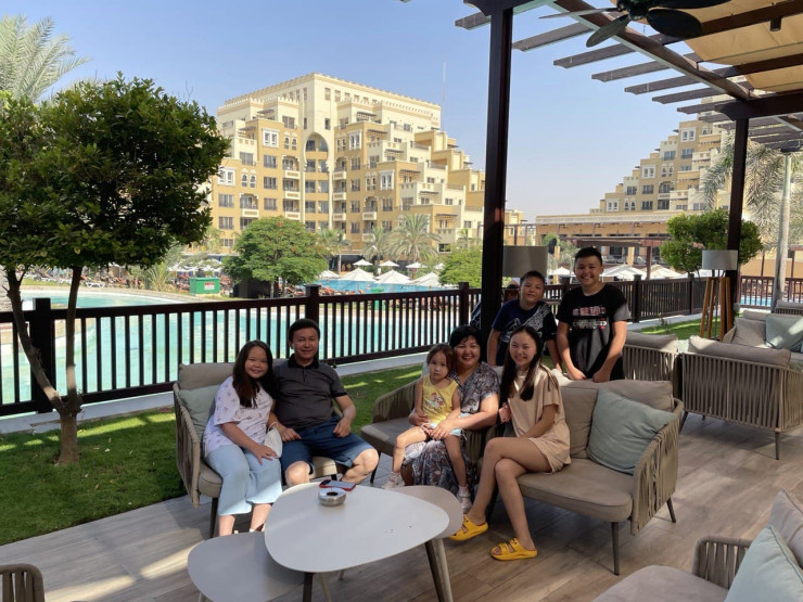 Семья из Жамбылской области с семью детьми летела с нами одним рейсом, и, к удивлению, мы остановились в одном и том же отеле. Как говорит Ерлан, в Эмиратах почти во всех отелях очень хорошие условия, они мониторили и читали много отзывов и выбрали летний отдых в ОАЭ. В Шарджу семья прилетела из Алматы, но далее решила остановиться в отеле Rixos Bab Al Bahr, который находится в курортном городе Рас-эль-Хайма. У Ерлана четверо детей и плюс еще трое племянников и племянниц.