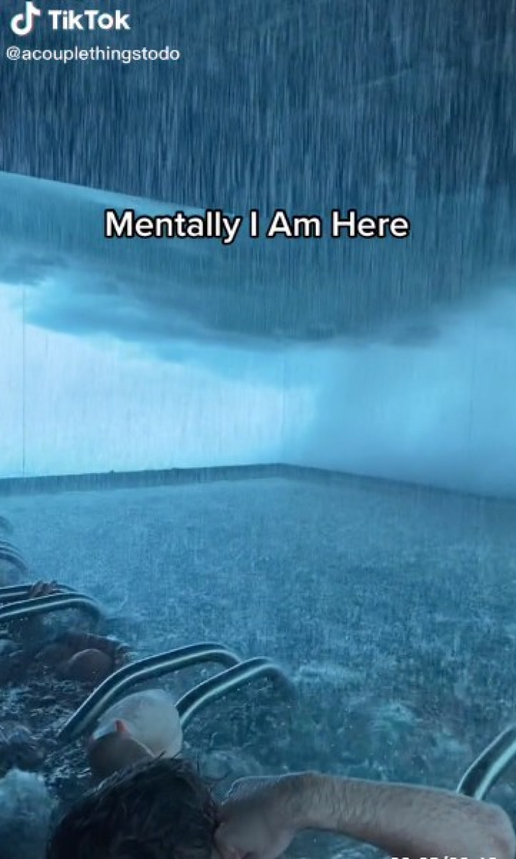 В ролике можно увидеть, как отдыхающих в бассейне поливает водой специальная разбрызгивающая система, "заменяя" собой проливной дождь. Картину дополняют вспышки молнии и мрачные тучи.