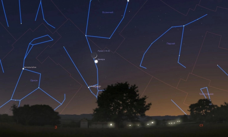 Венера появляется на небе вечером, после захода Солнца. Ночью 23 апреля минимум два часа можно понаблюдать за планетой, рядом с которой сияет полумесяц. Оба небесных тела находятся в созвездии Тельца.