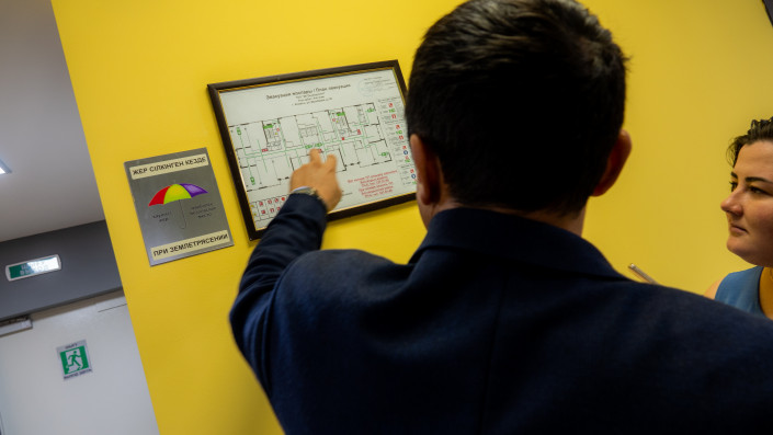 Первым делом Ералы Шокбаров изучает план эвакуации, который есть в каждом здании на каждом этаже. На схеме видны конструктивные особенности здания, какие стены являются несущими, а какие - нет.