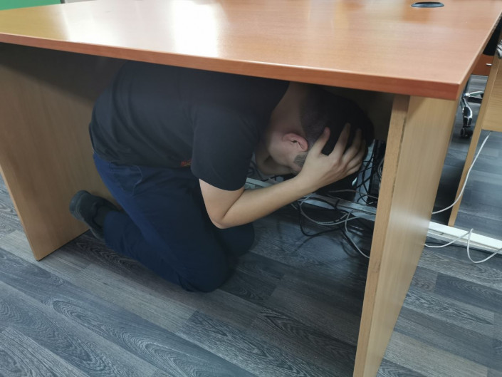 "Если вы понимаете, что не успеете спуститься вниз после первых толчков, то разумно будет спрятаться под стол. При этом важно занять правильную позу: на коленях, руками прикрыв голову.