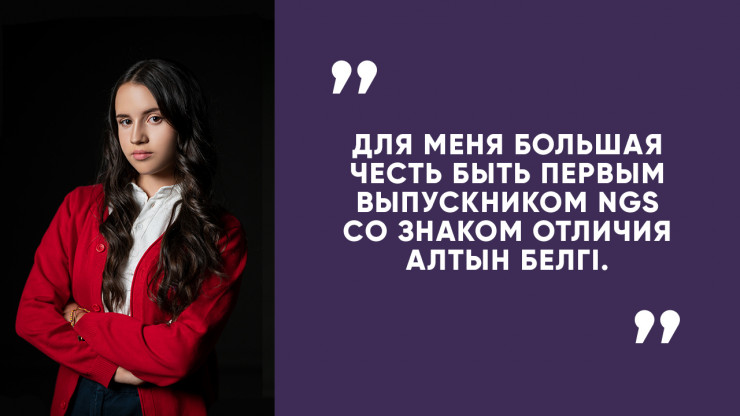 От себя я хотела бы пожелать будущим выпускникам пробовать себя в разных сферах, чтобы найти занятие по душе и определиться со специальностью в университете. Человек должен выбрать профессию, которая будет приносить ему удовольствие. Так жизнь будет намного увлекательнее и полнее. Также посоветую несильно стрессовать по поводу выбора профессии. В определенный момент вы это сами осознаете. Хочу особо отметить роль NGS в своей жизни. Школа дала мне максимум возможностей развиваться и укреплять знания. Мои учителя, огромная им благодарность, всегда имели стремление и профессионализм давать нам материал сверх плана урока, и это особо ценно. Ведь не каждый преподаватель готов двигаться вперед ради того, чтобы его ученики имели возможность быть на шаг впереди остальных".