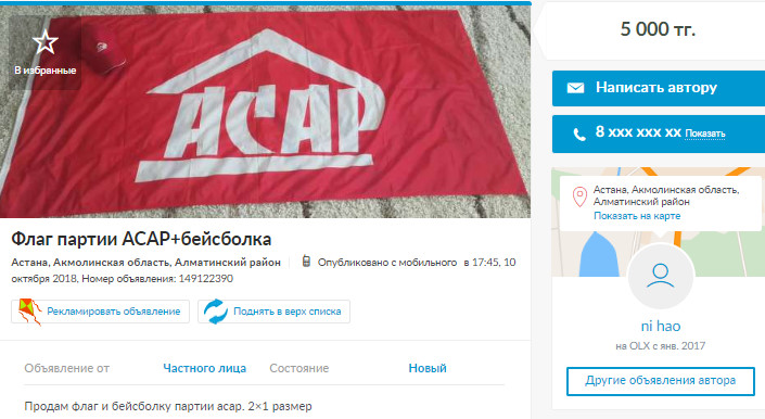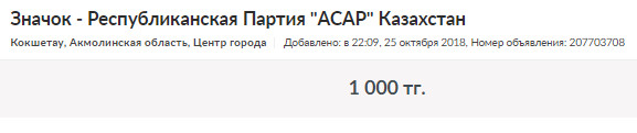 Кстати, история партии "Асар", по всей видимости, представляет какую-то ценность для коллекционеров. Так, на сайте объявлений можно найти любопытные предложения. Значок партии "Асар" там продают за 1000 тенге, а флаг и бейсболку - за 5000.