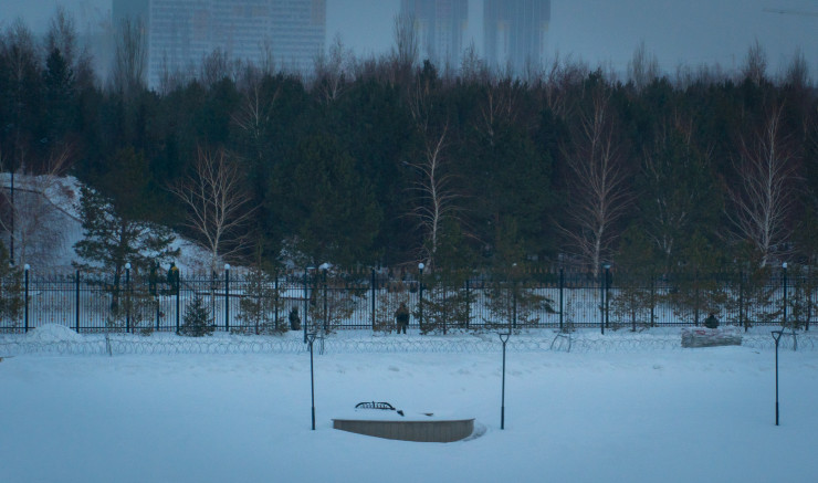 От автомобильного моста до Акорды вдоль берега реки Есиль тянется вереница колючей проволоки, за которой несут службу военные.