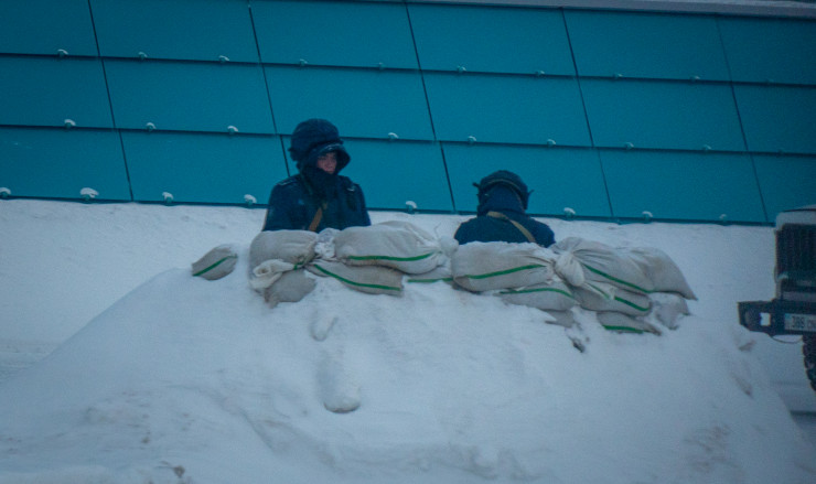 Несет свою службу солдат на морозе, стоя в укрытии из мешков.