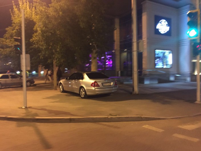 А здесь - очередная парковка в неположенном месте. Водитель оставил свой Mersedes на тротуаре рядом с баром Barley. Время инцидента - 22.50, 29 июля.