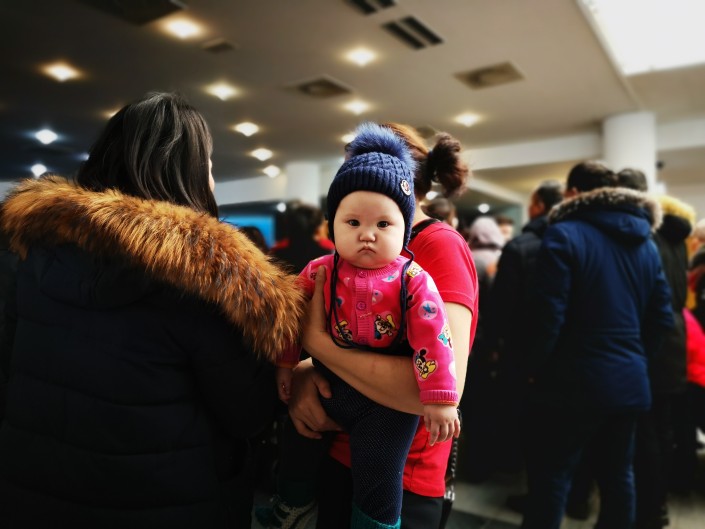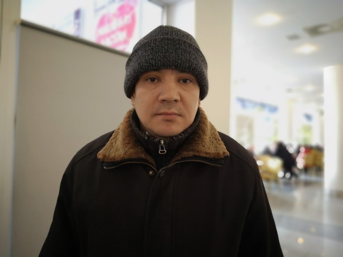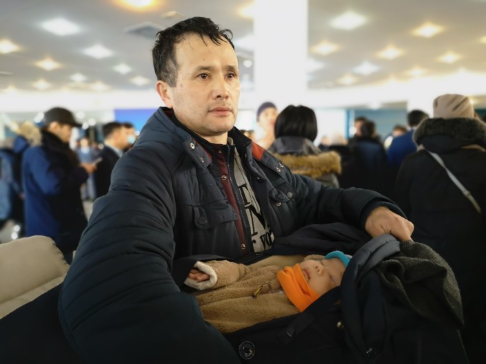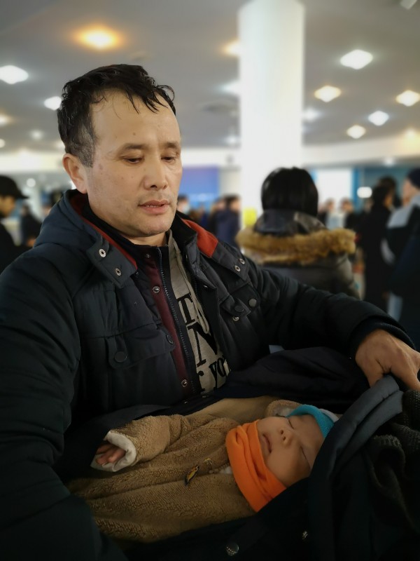 А вот стоит другой мужчина с люлькой в руках, в которой спит ребенок. Зовут его Болат. Он стоит в этой очереди бог знает сколько времени. И все держит ребенка. На лбу у мужчины выступил пот.