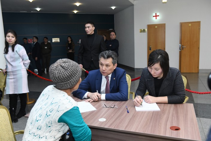 После выступления за трибуной в зале аким Бахыт Султанов лично сидел и принимал граждан.
