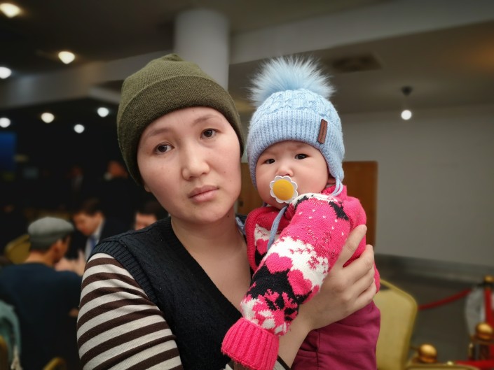 А вот с ребенком на руках мать четырех детей Гульмира. Их она воспитывает без мужа.