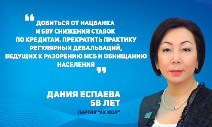 "Если министр или глава Нацбанка заявил, что девальвации не будет, а она происходит, - такой чиновник должен подать в отставку. Упростить налоговое администрирование и отчетность, отказаться от ареста счетов и остановки расходных операций бизнеса. Отменить штрафы для предпринимателей, если их нарушения не нанесли ущерба государству или другим лицам", - говорится в предвыборной программе Дании Еспаевой.