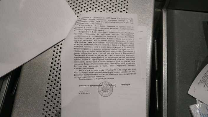 Среди многочисленных писем, которые он нам демонстрирует, ответ Комитета внутреннего государственного аудита Министерства финансов Казахстана.