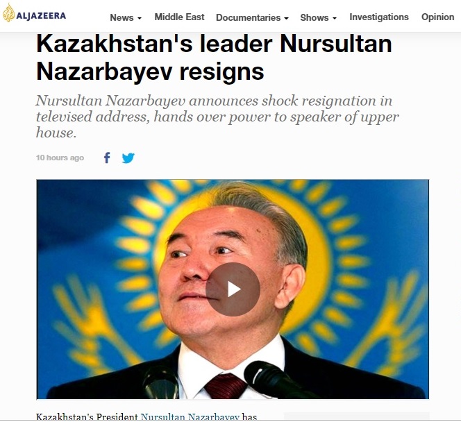 Телеканал Аljazeera на своем сайте пишет, что Нурсултан Назарбаев в своем телевизионном обращении сказал, что принял "трудное" решение прекратить свою власть в качестве президента, но не назвал конкретной причины шокирующего решения.