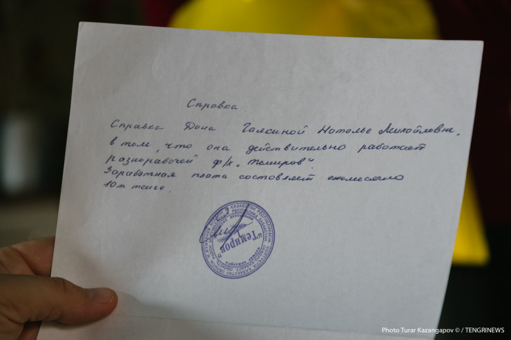Она демонстрирует справку с места работы шестилетней давности. Судя по этой бумаге, ее зарплата на тот момент составляла 10 тысяч тенге.