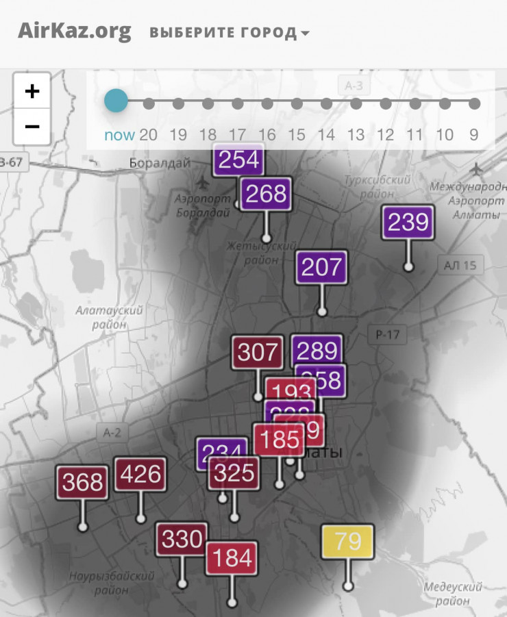 Тем не менее считаю, что грязнее всего воздух в нижней части города, где ТЭЦ-2, проспекты Райымбека и Рыскулова и наиболее интенсивное движение 24 на 7, а также сосредоточен весь автохлам.