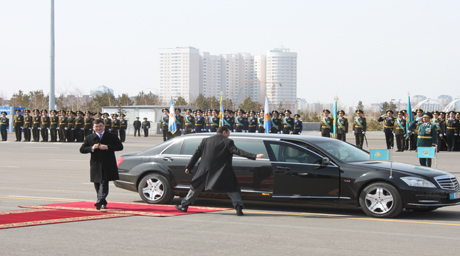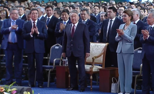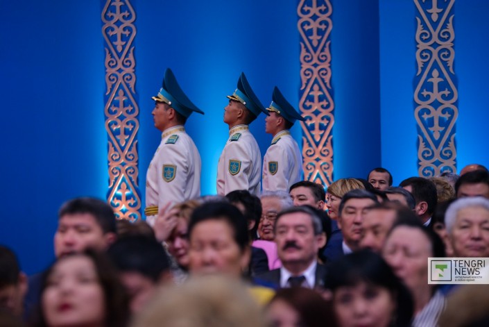 После торжественного внесения в зал флага, Конституции и президентских символов объявили Первого Президента Нурсултана Назарбаева. Под узнаваемую мелодию он проследовал в зал на почетное место. Рядом с ним сидела спикер Сената Дарига Назарбаева. А по правую руку - премьер-министр Аскар Мамин.