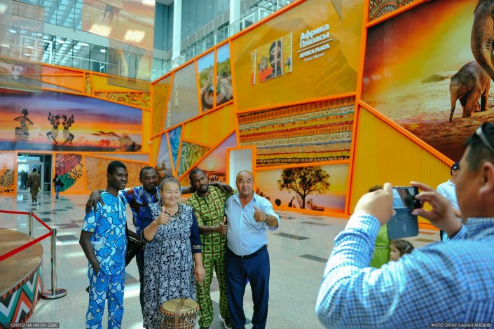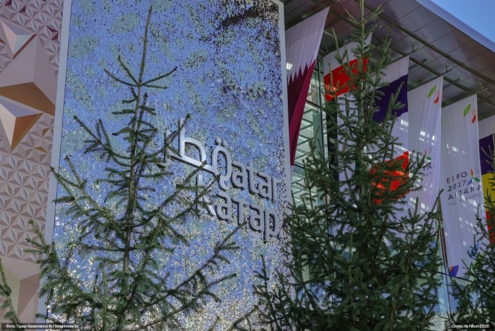 Одним из популярных стендов среди павильонов для любителей селфи был павильон Катара. Чтобы сфотографироваться на фоне баннера "в золоте" выстраивались в очередь.