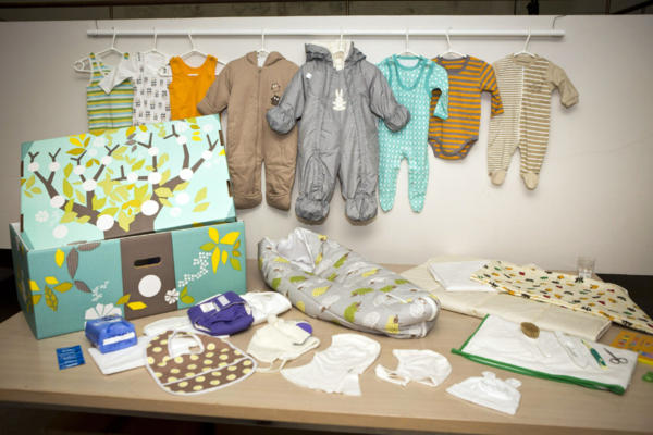 Коробка, которую можно использовать как колыбель, матрас, непромокаемый наматрасник, простыня, пододеяльник, спальный мешок или одеяло, зимний комбинезон, шапочка, утепленные варежки и пинетки, легкий комбинезон с капюшоном и вязаные кофточки, носки и варежки, вязаная шапочка,  ползунки, комбинезоны и леггинсы, банное полотенце с капюшоном, ножницы для ногтей, щетка для волос, зубная щетка, термометр для ванны, детский крем, губка, многоразовые подгузники и марлевые пеленки, книга с картинками и игрушка для режущихся зубов, прокладки для бюстгальтеров и презервативы.