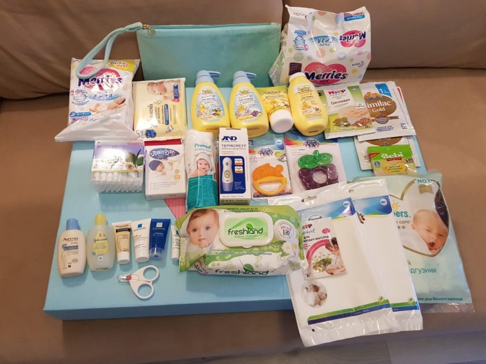 Бокс, матрас размером 70 на 46 сантиметров, пеленки, шесть штук, теплый комбинезон на зиму, комбинезон утепленный на весну, одеяло теплое, соска, бутылочка, ножницы детские, расчески, термометр электронный, две штуки прорезывателей для зубов, подгузники, влажные салфетки, ватные диски, палочки с ограничителями.