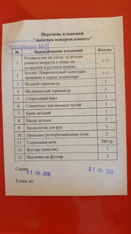 В Казахстане родителям новорожденного ребенка полагается бесплатная аптечка. В нее входит стерильный бинт, вата, слизеотсос для носа, детский крем, мыло, антисептик для рук, соль, градусник.