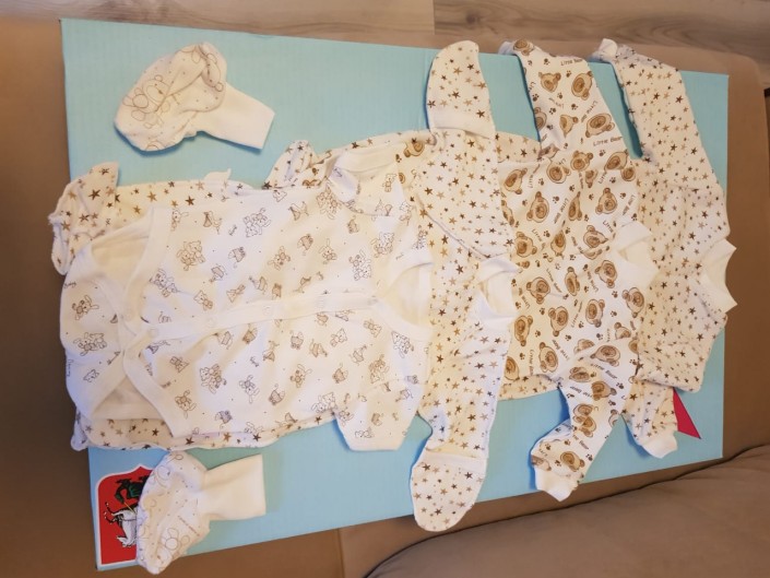 Три шапочки, две пары царапок, три штуки ползунков, кофточки, боди, лактазар, гель для умывания, шампунь, присыпка, крем под подгузник, клеенки, две штуки. Разные пробники от фирм: подгузники, каши, пюре, салфетки, кремы, гели, шампуни, чай для кормящих матерей.